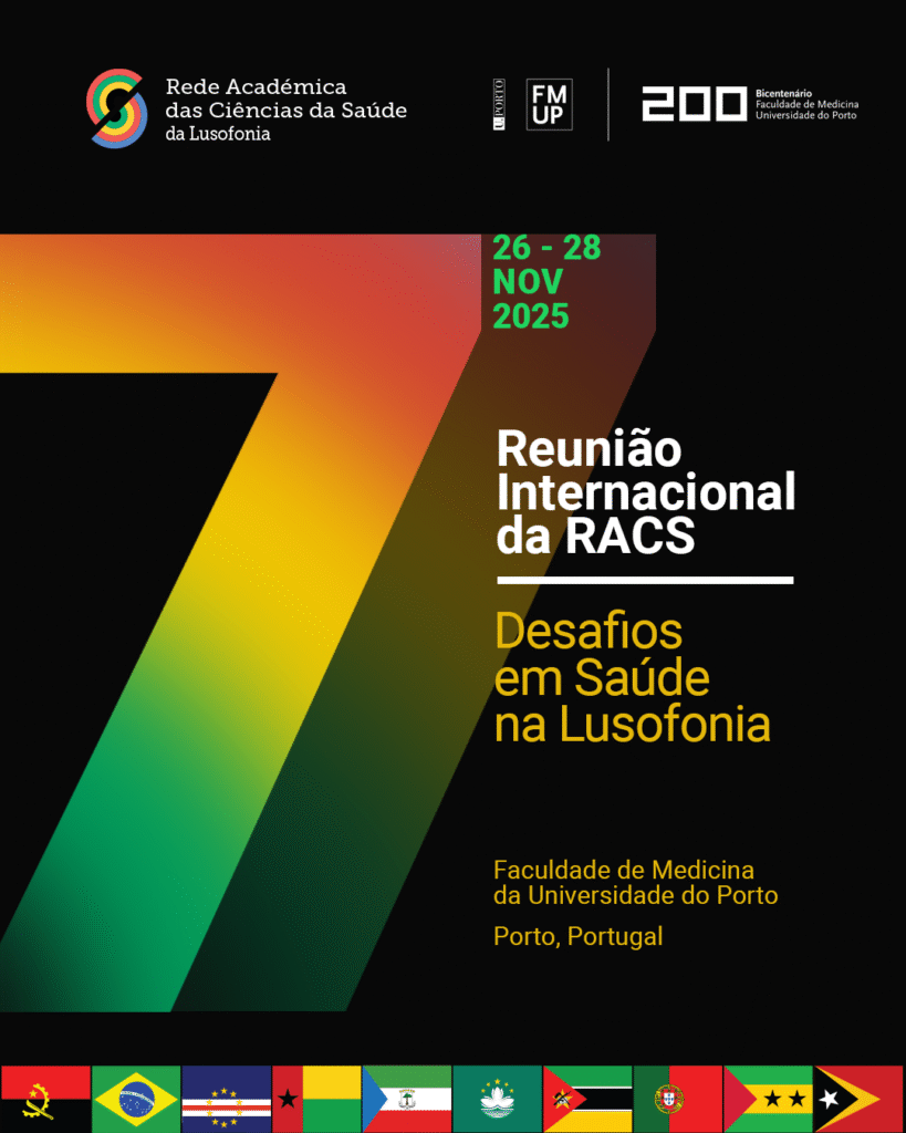 É com enorme satisfação que anunciamos que a RACS – Rede Académica das Ciências da Saúde da Lusofonia vai realizar a sua 7.ª Reunião Internacional – 7ª rRACS, 2025 nos dias 26, 27 e 28 de novembro de 2025, na Faculdade de Medicina da Universidade do Porto, Porto, Portugal, sob o tema “Desafios em Saúde na Lusofonia“.